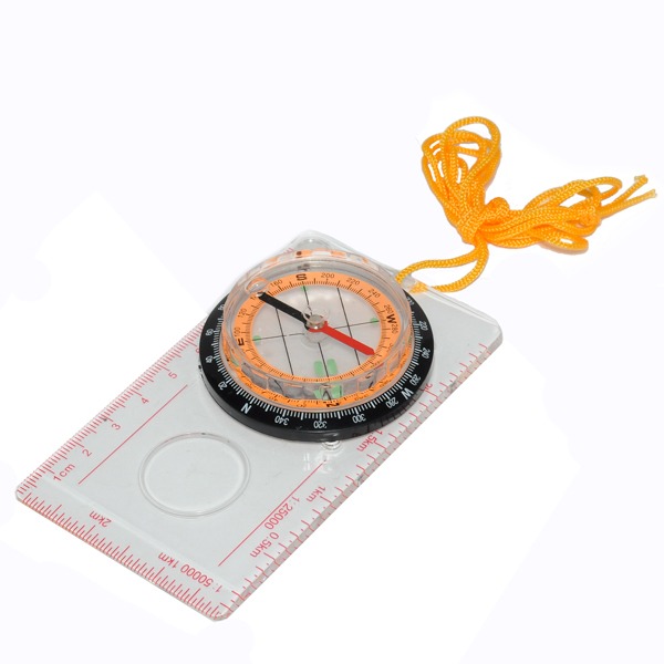 Компас помещён на прозрачную площадку с линейкой, на которой так же числятся увеличительное стекло, круглые и треугольные отверстия, позволяющие рисовать символы на карте карандашом.